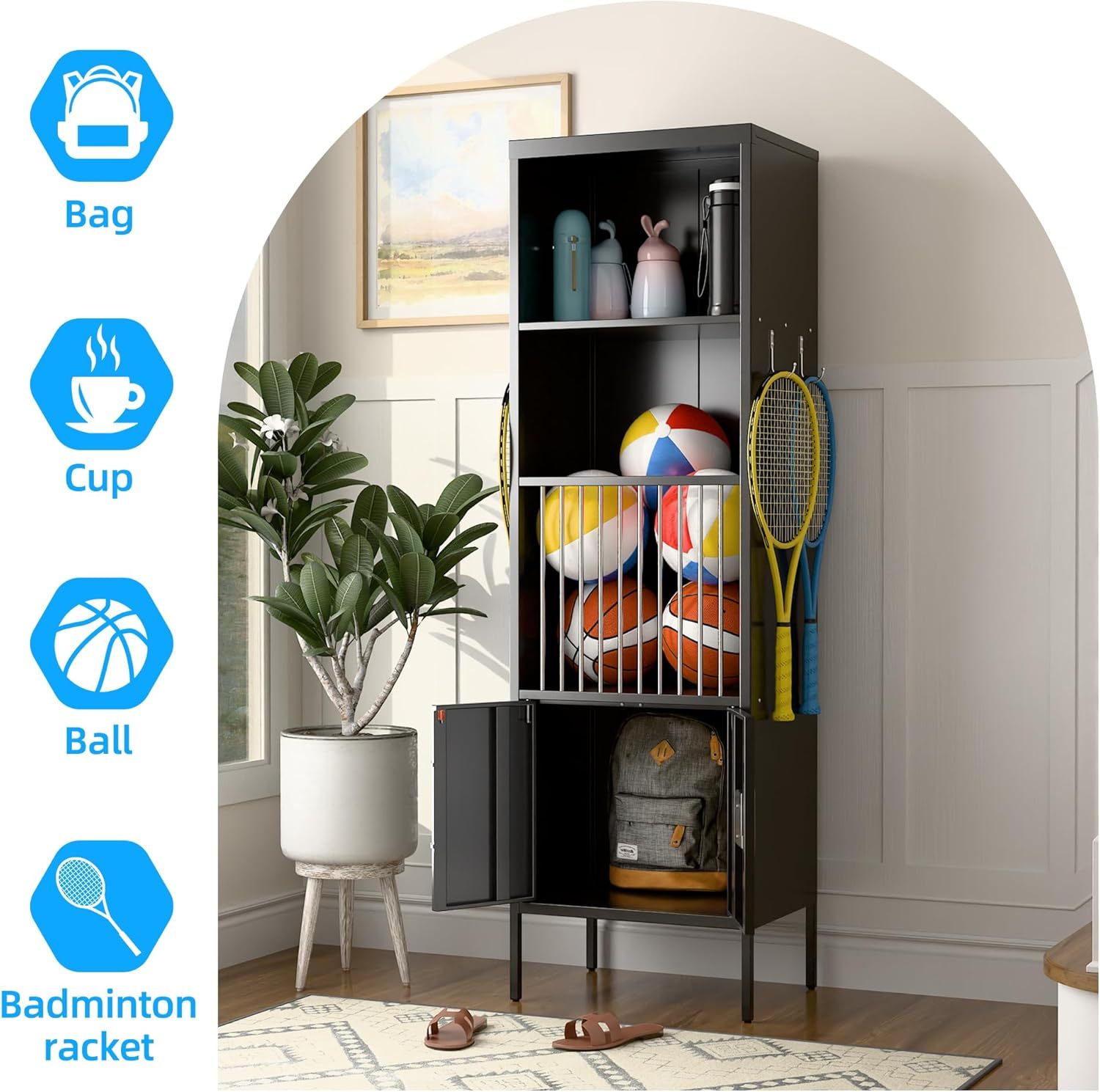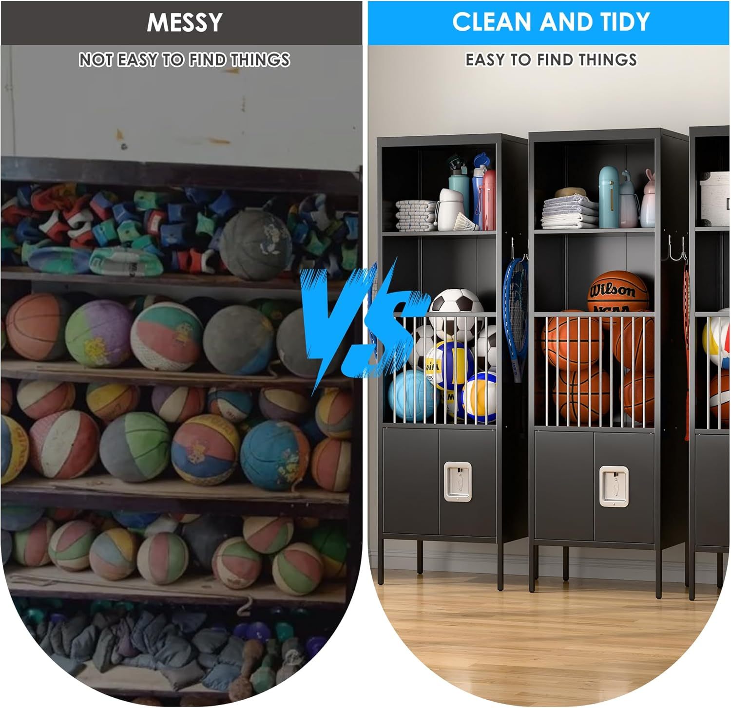 • 【Upgraded Design Sports Storage Locker】Our sports equipment storage locker have a total of 3 levels, including open top compartments, metal fence cages in the middle, lockable metal sports locker at the bottom. (Used for storing cups, towels, helmets, gloves, various balls, rackets, valuables, etc.)